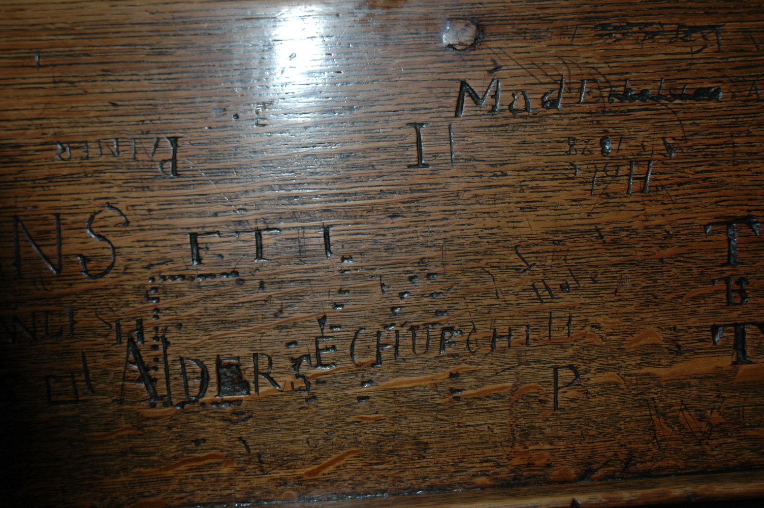 A relative of Sir Winston Churchill carved his name on one of the College Chapels desks.
